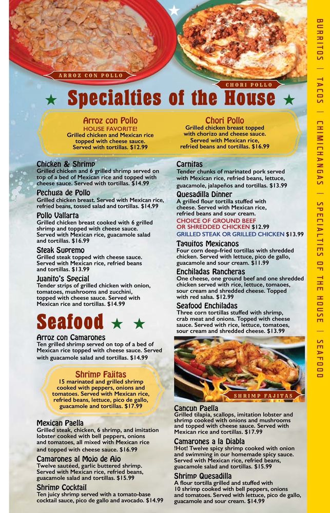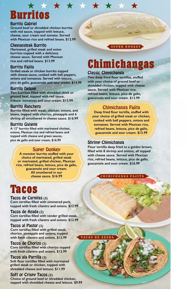" four tortilla filled with ground beef or shredded chicken, topped with red burrito sauce and cheese. Served with Mexican rice, refried beans, lettuce, tomatoes, shredded cheese, and sour cream.