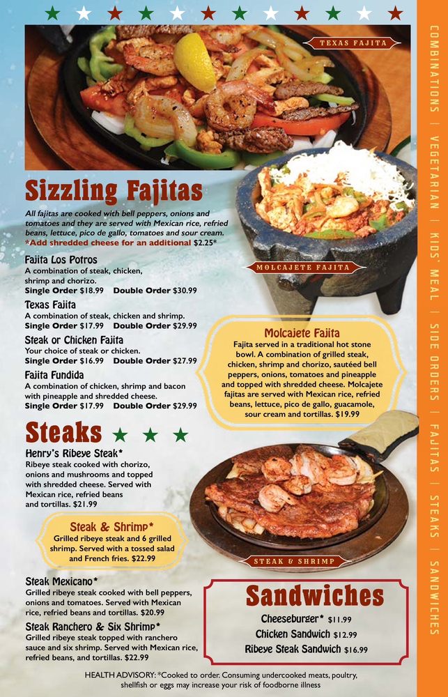 Tender strips of chicken or steak cooked with bell peppers, onions, and tomatoes. Served with Mexican rice, refried beans, lettuce, pico de gallo, guacamole and sour cream.
